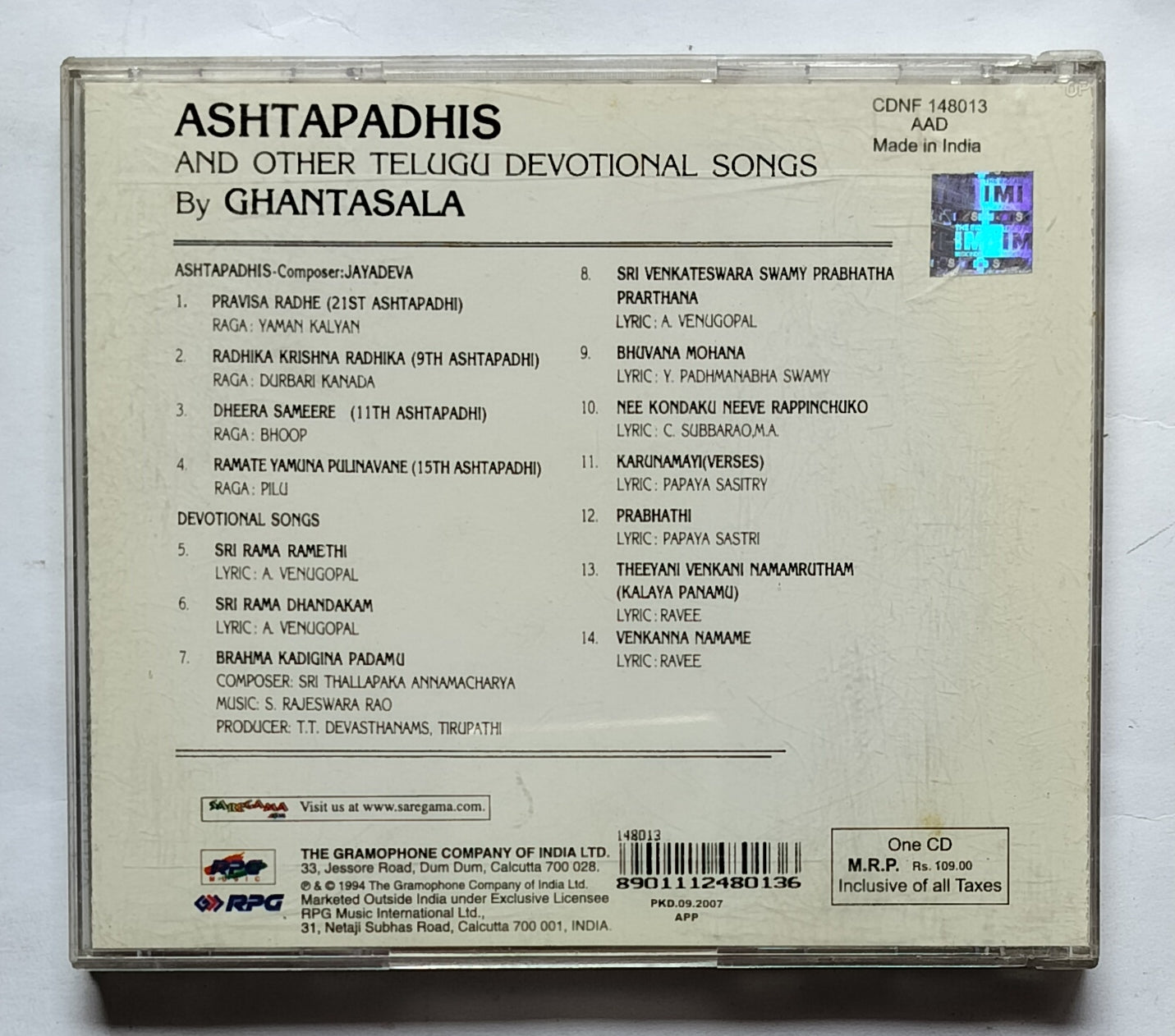 Ashtapadhis And Other Telugu Devotional songs By : Ghantasala