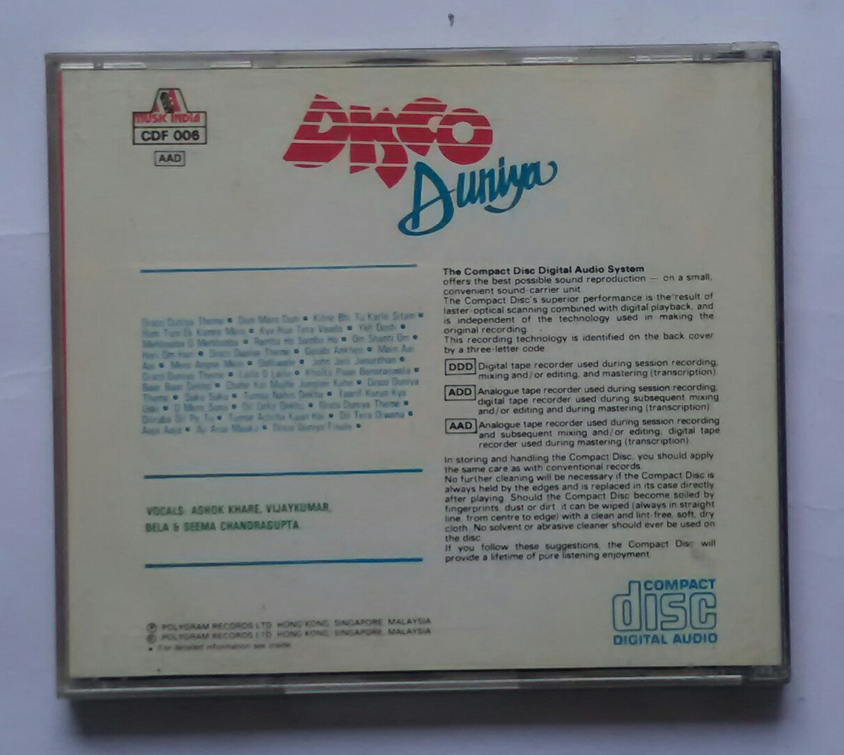 Disco Duniya " Vocals : Ashok Khare , Vijay Kumar, Bela & Seema Chandragupta . " .