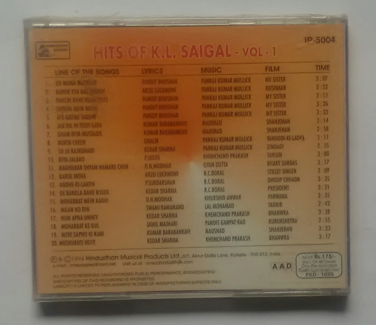 Hits Of K. L. Saigal " Vol : 1 "