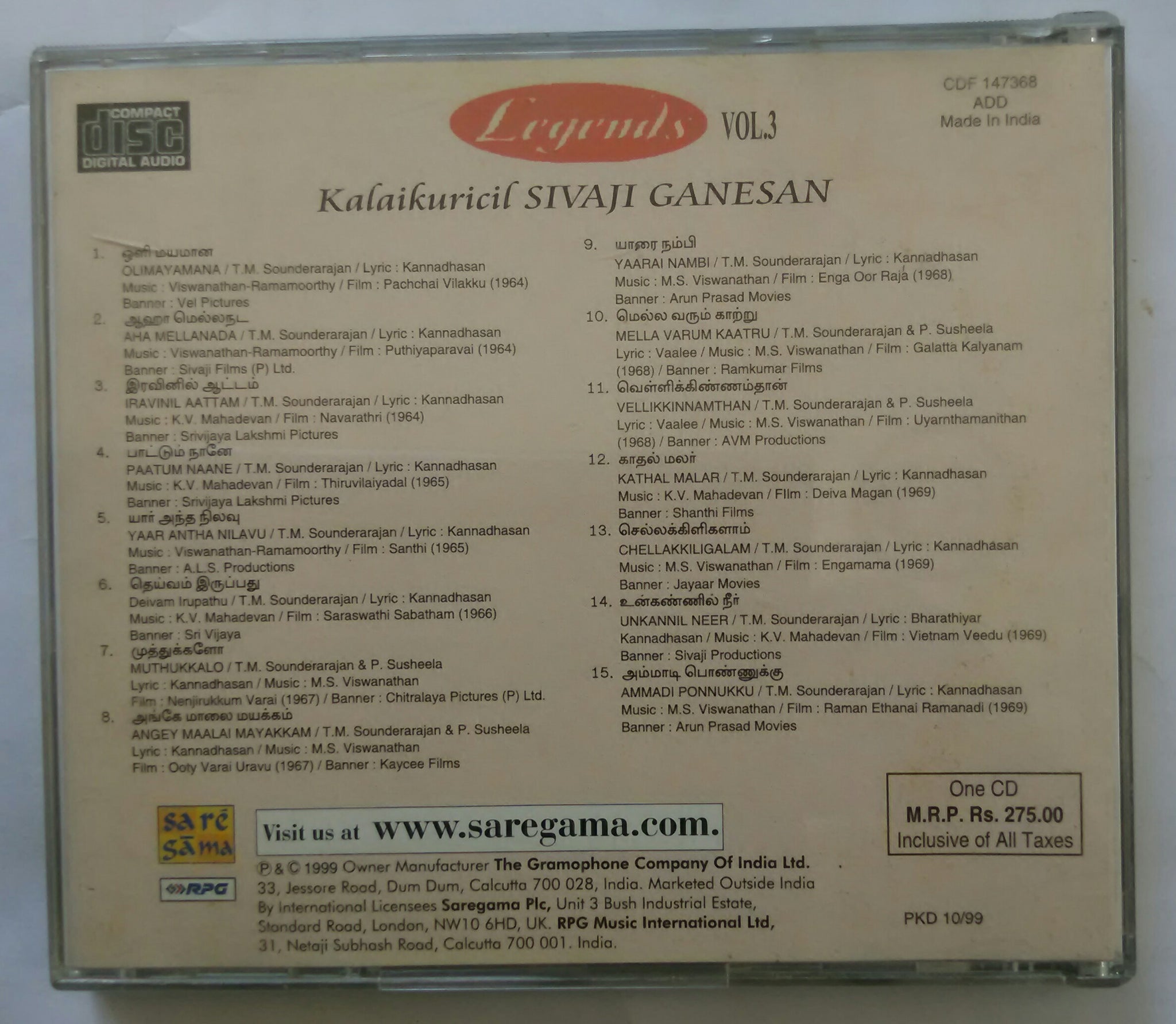 Legends Vol :3 ( Kalaikuricil Sivaji Ganesan ) Tamil Film Songs
