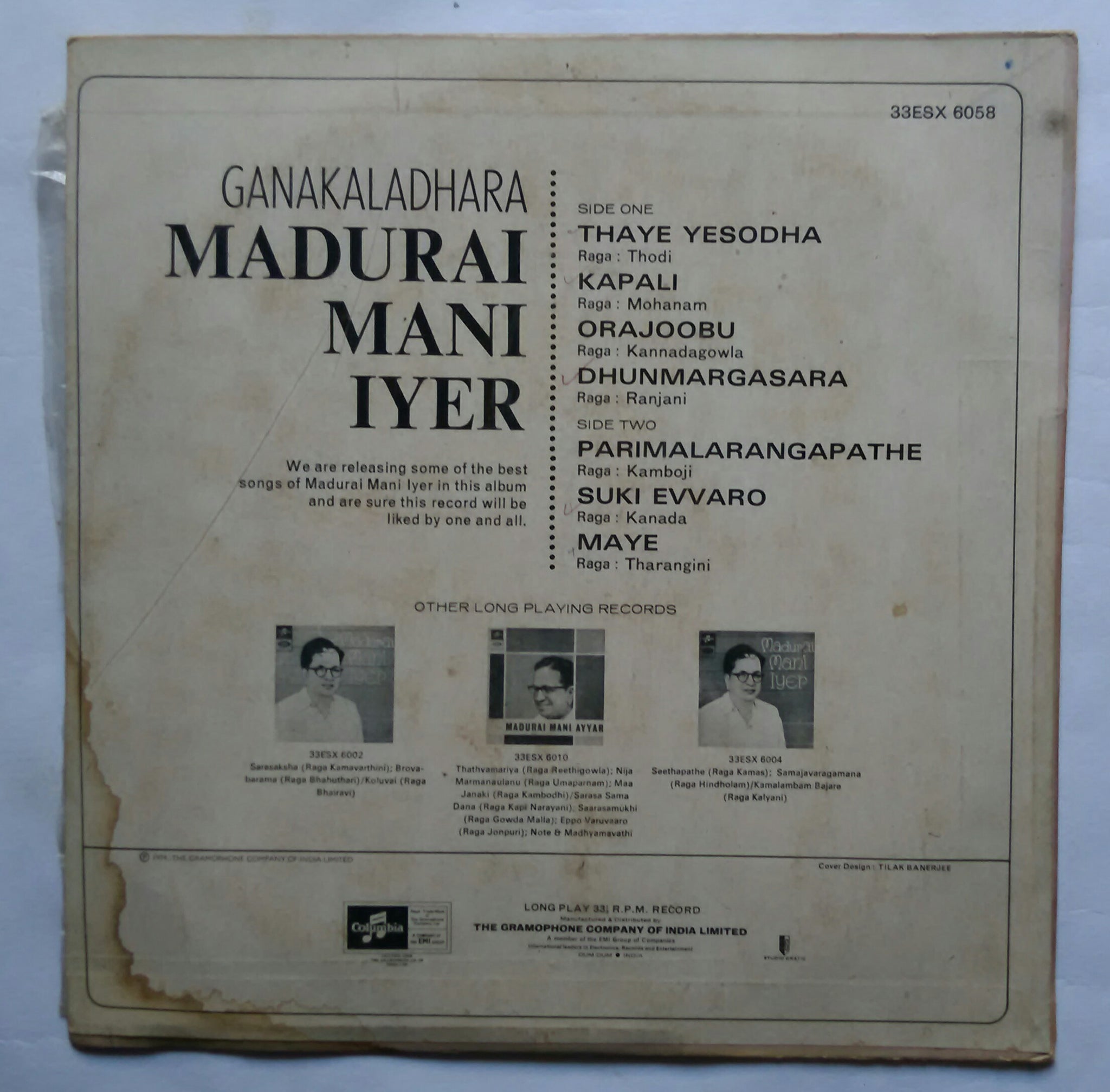 Ganakaladhara Madurai Mani Iyer ( LP 33/ RPM - ESX 6058 )