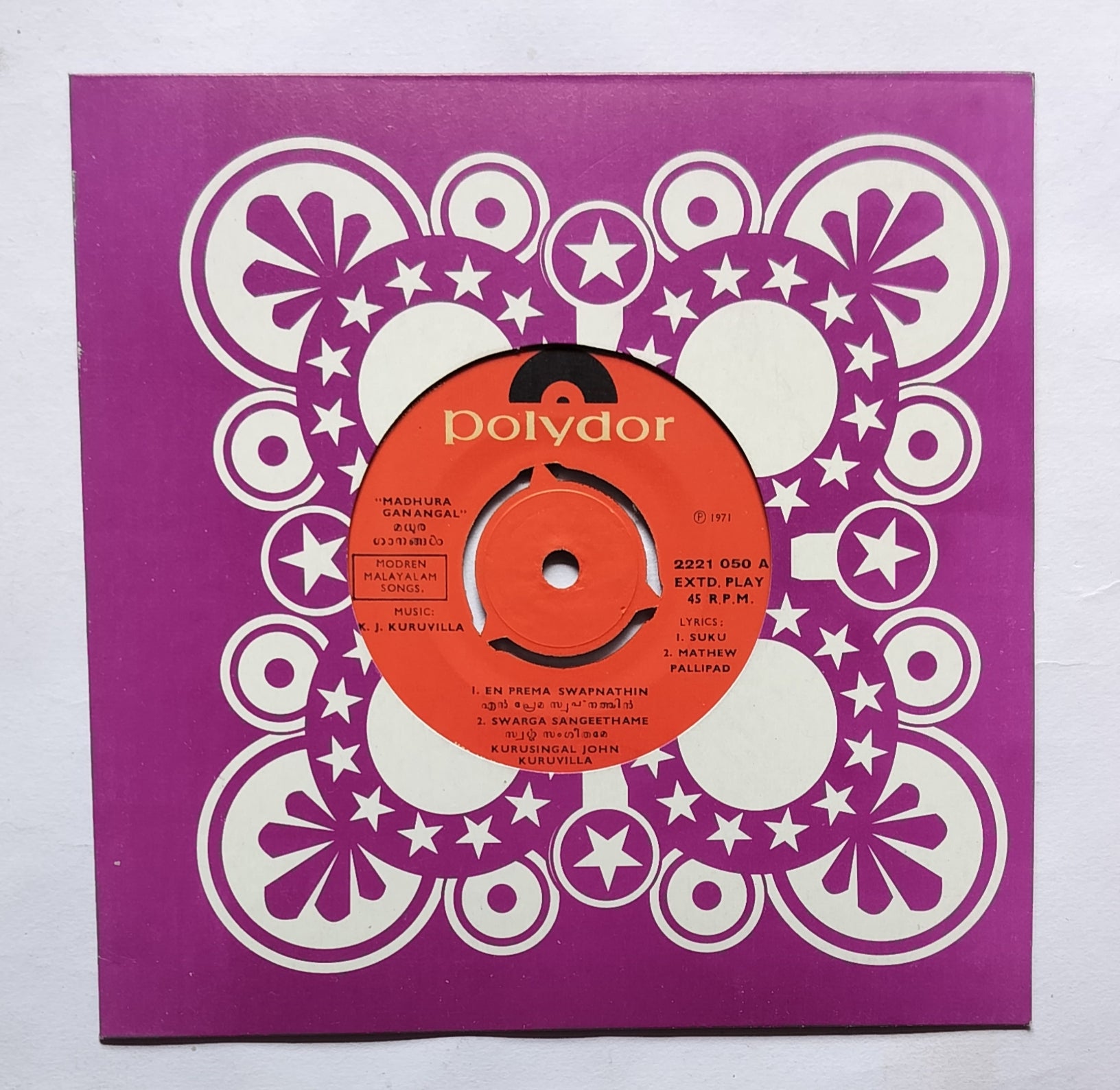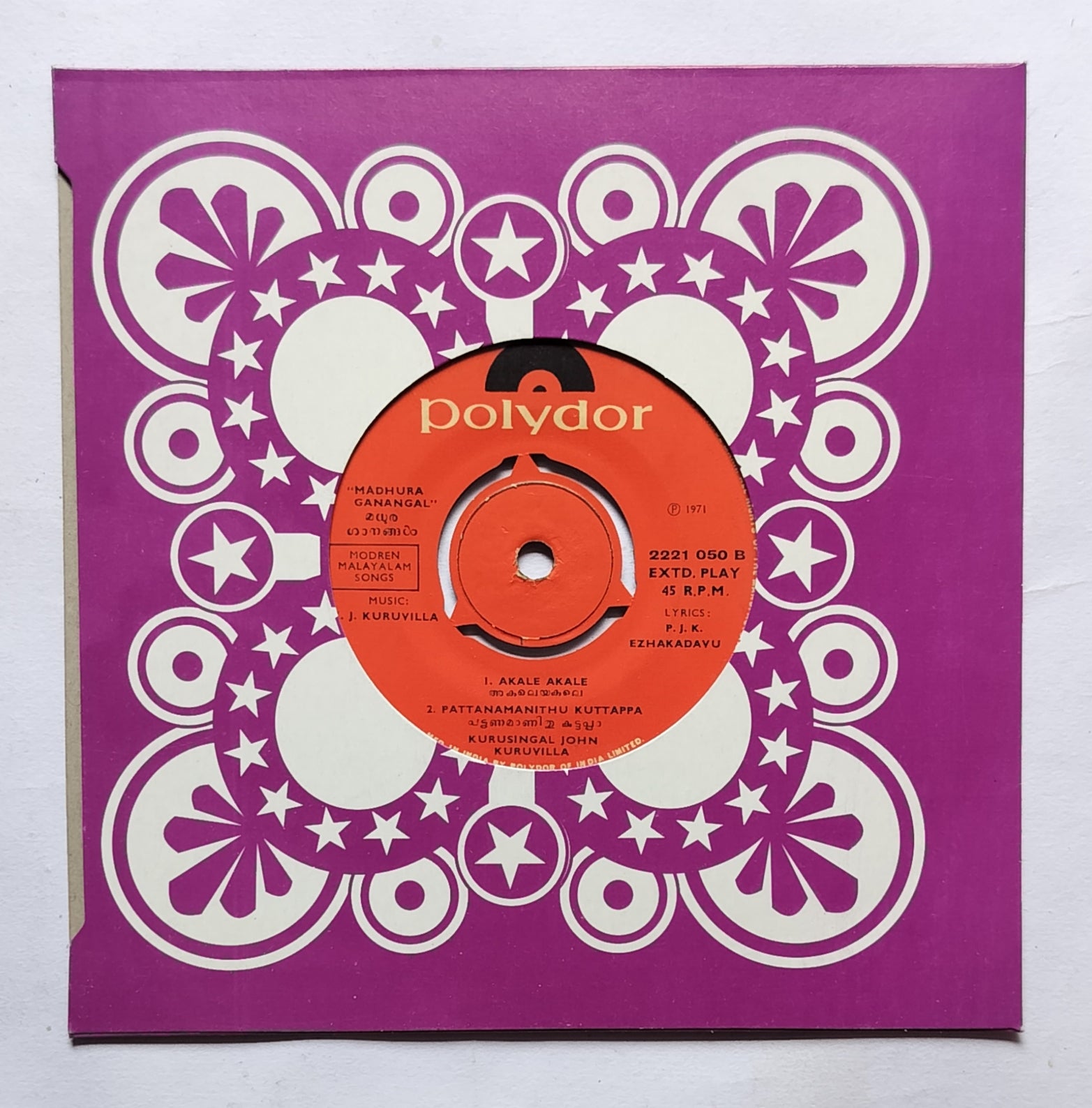 Madhura Ganagal (EP, 45 RPM) Modern Malayalam Songs " Music : K. J. Kuruvill " Side A, 1, En Prema Swapnathin , 2, Swarga Sangeethame , Side B, 1, Akale Akale , 2, Pattanamanithu Kuttappa .