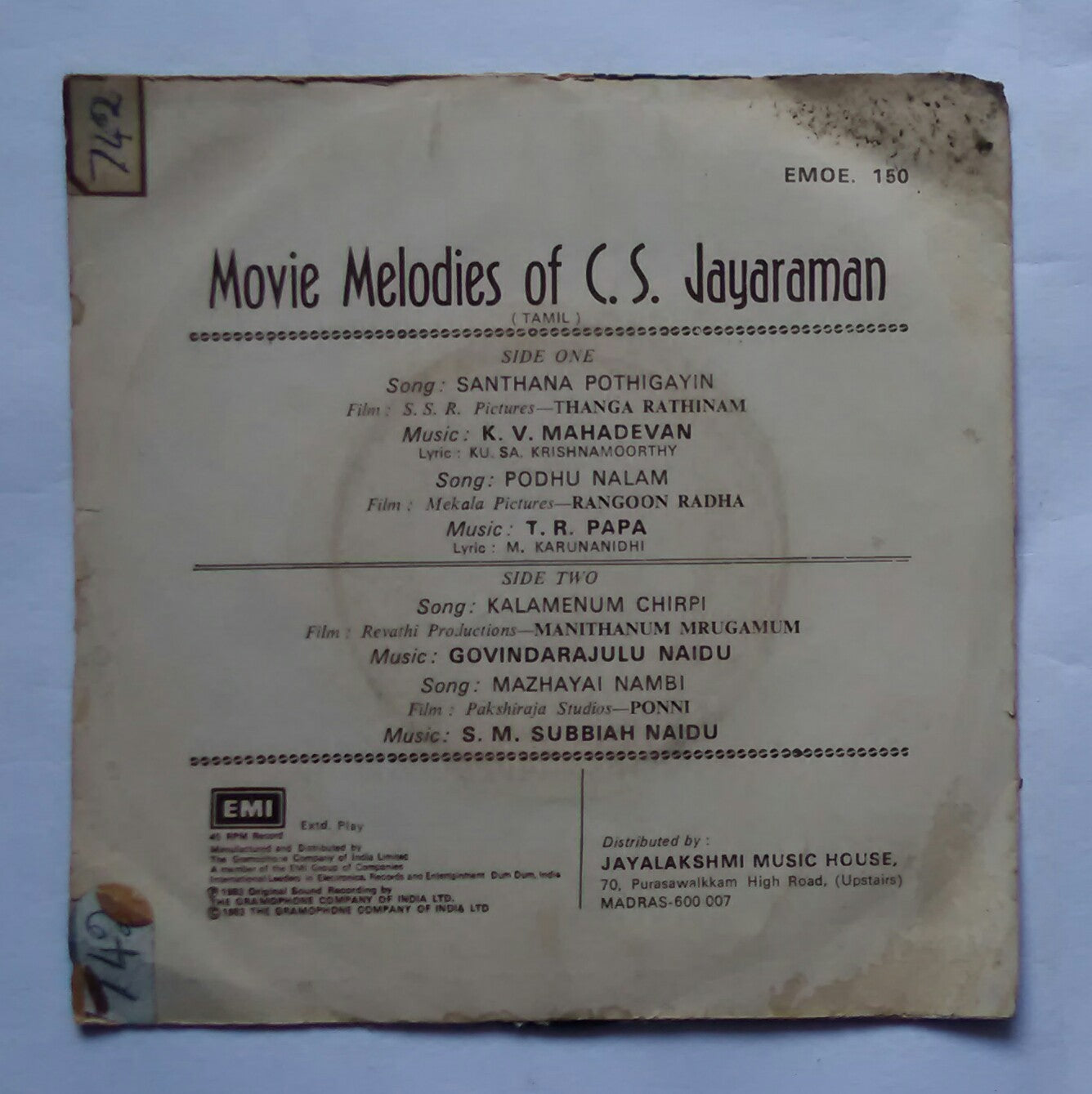 Movie Melodies Of C. S. Jayaraman " EP , 45 RPM "