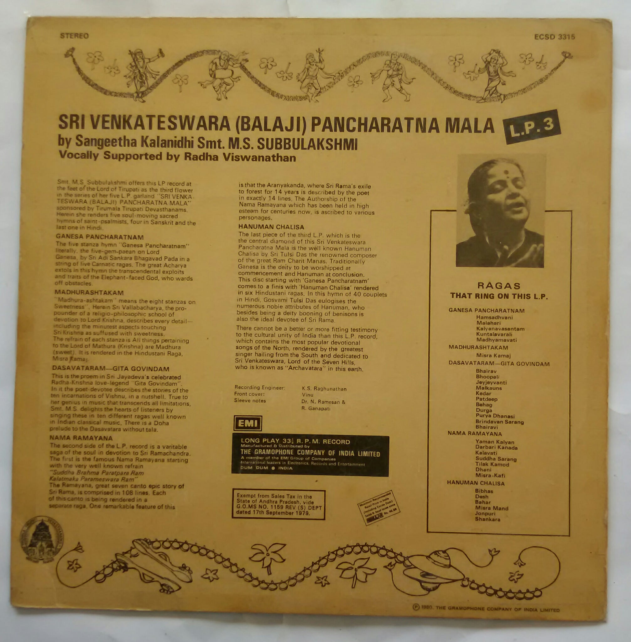 Sri Venkateswara ( Balaji ) Pancharatna Mala M. S . Subbulakshmi LP 3
